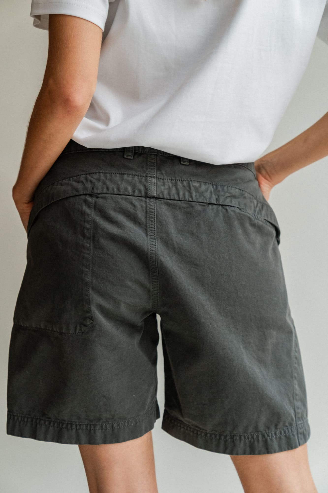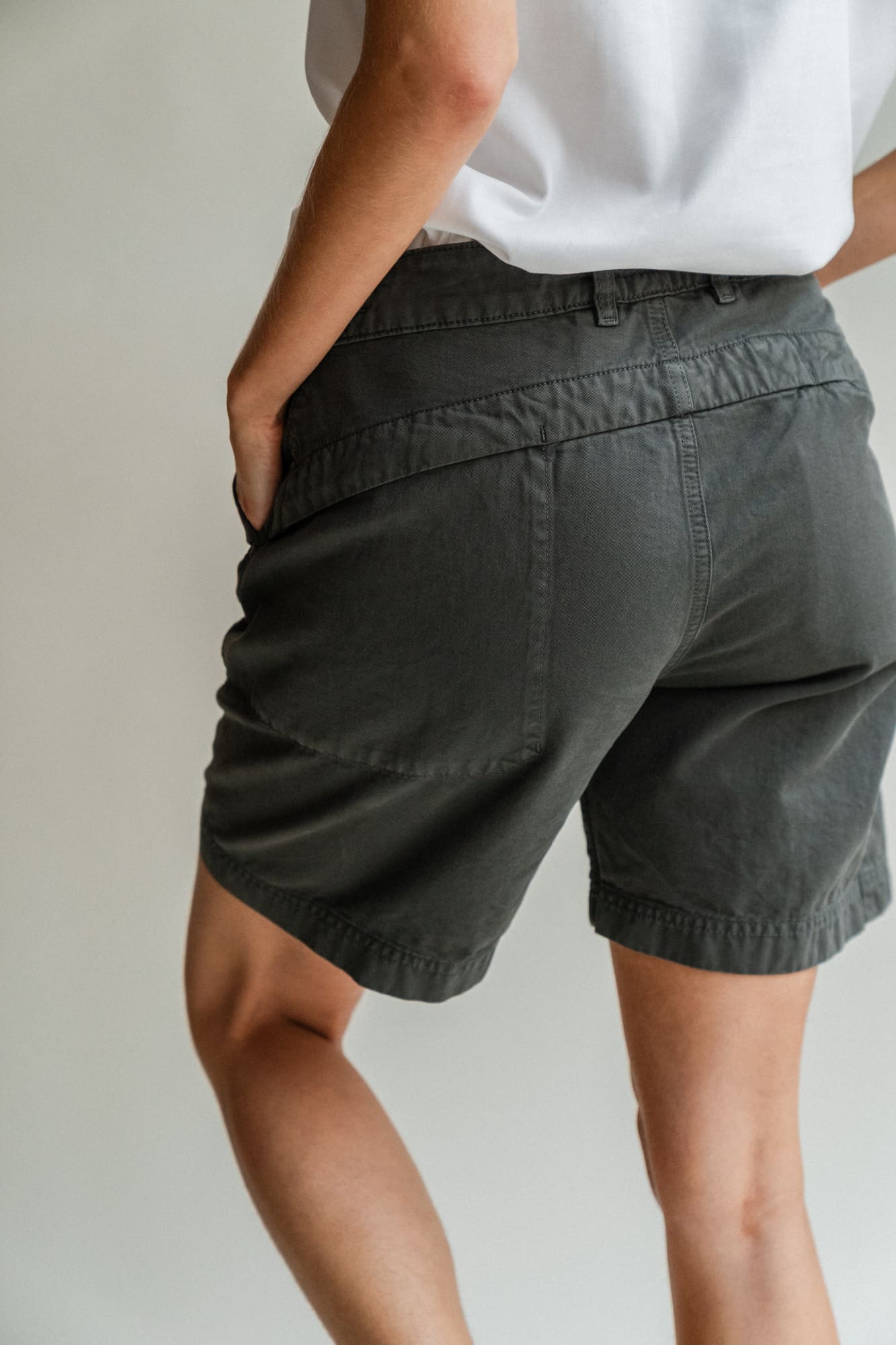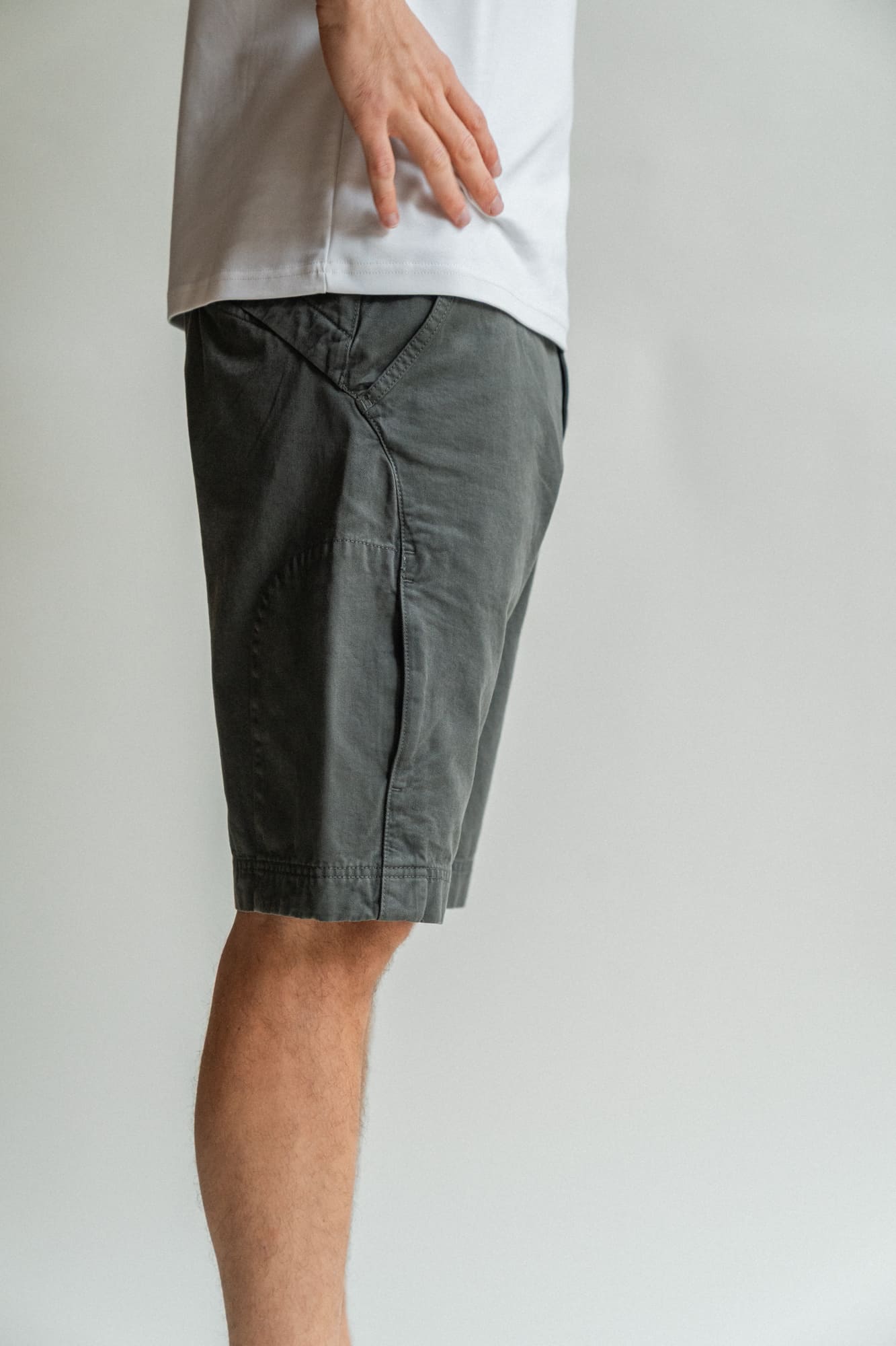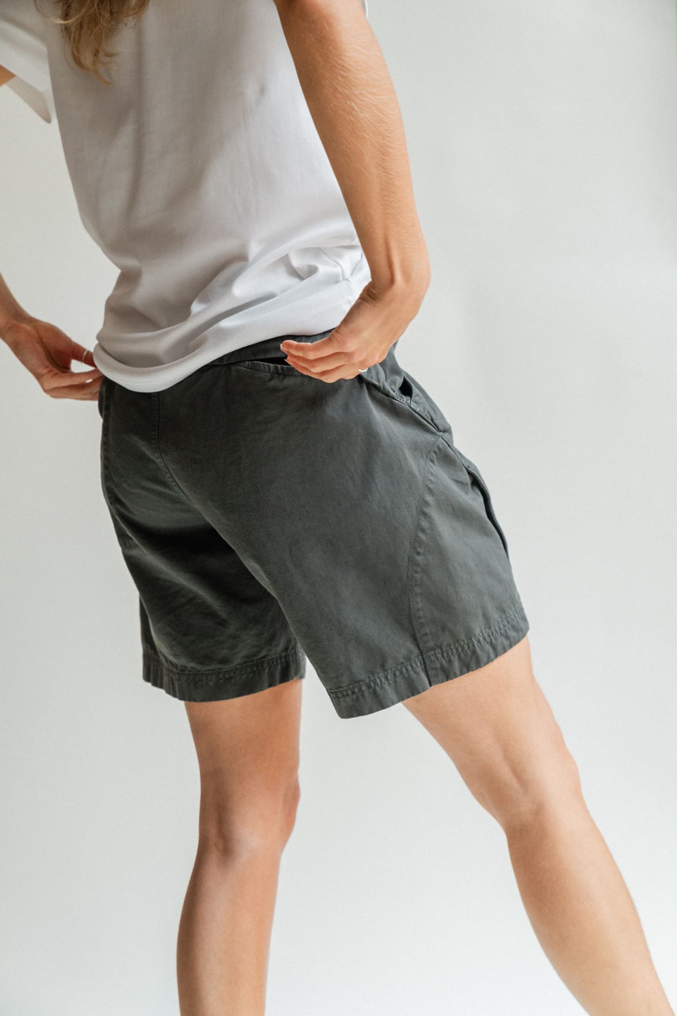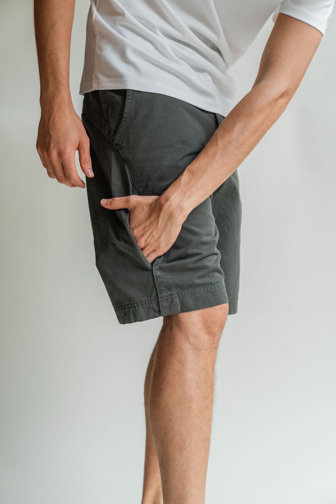 The Shorts are made of a thick and sturdy, yet soft and comfortable Italian cotton quality, with a construction that makes it extra durable. The seams are also sewn together with 100% cotton thread. The shorts have two open pockets in the front and two in the back. Additionally, there is a hidden zippered pocket on the side with space for your smartphone, placed conveniently to maintain a minimalist and sleek appearance. The shorts have a hidden drawstring inside for easy waist adjustment.