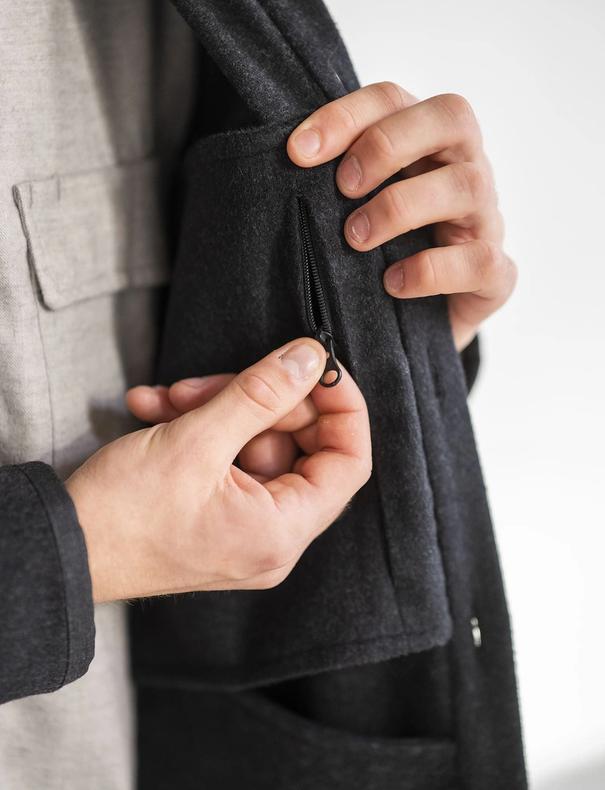 To store brystlommer med skjult knapp under klaffene. En skjult «knagg» på venstre brystlomme til brillene. Store sidelommer med glidelås. Og en innerlomme med glidelås til mobil, kart eller andre viktige småting. Funksjonelt, uten å miste stilen.
