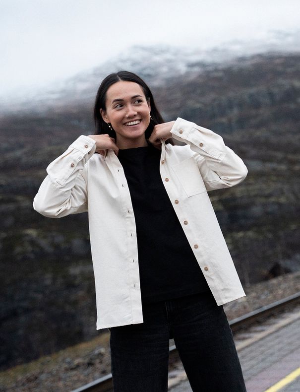 Denne historien er ganske rå. Hovedmaterialet er laget av 70% resirkulert bomull og 30% økologisk bomull. Det har en grov vevet struktur og er helt ufarget. (Farging er det som bidrar mest til klimautslipp i produksjonen av et klesplagg) Sytråden er også i bomull. Det fungerer fordi hovedtekstilet er såpass kraftig i seg selv. Knappene er laget i Corozo, nøtten fra Amazonas som faller naturlig ned fra treet og skaper lokale arbeidsplasser. Til og med alle labels (vaskelapp, logo etc) er i ufarget bomull.