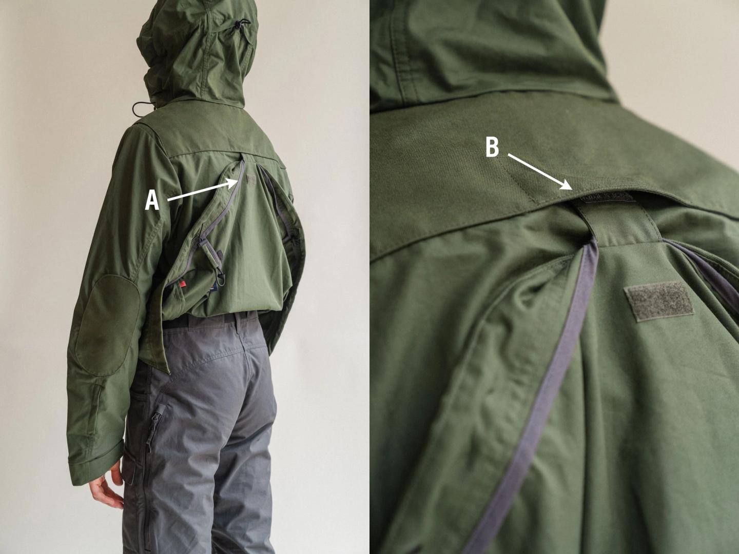 Sånn funker det: På innsiden av ryggen, nederst på jakken finner du en borrelås (A). Når du åpner jakken foran, enten ved å ha den åpen eller dra opp den nederste glidelåsen – kan du brette opp ryggen. Der fester du borrelås A til borrelås B, som sitter skjult i “garasjen” under skulderforsterkningen. (Se bilde)