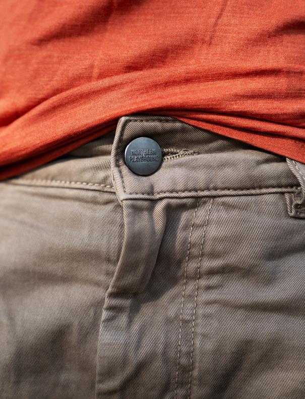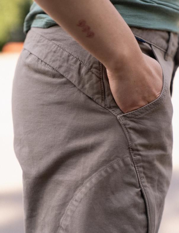 Shortsen er forsterket i områder som er spesielt utsatt for slitasje, som i skrittet og rundt lommeåpningene. Etter tilbakemeldinger fra den første produksjonen har vi også byttet til en sytråd med polyesterkjerne for økt slitestyrke. Lommene har også et kraftig fôr i bomull for å motvirke hull og slitasje fra skarpe nøkler eller annet nips.