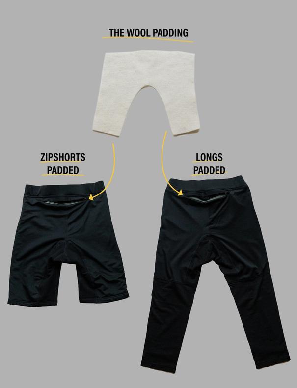 The Wool Padding er laget av 100 % norsk ull, produsert av Fredriksens Fabrikk i Telemark, der råull omdannes til filt i en helt mekanisk prosess – uten vann og kjemikalier. Paddingen er laget spesielt for Longs Padded og Zipshorts Padded, der den ligger i en egen lomme bak.